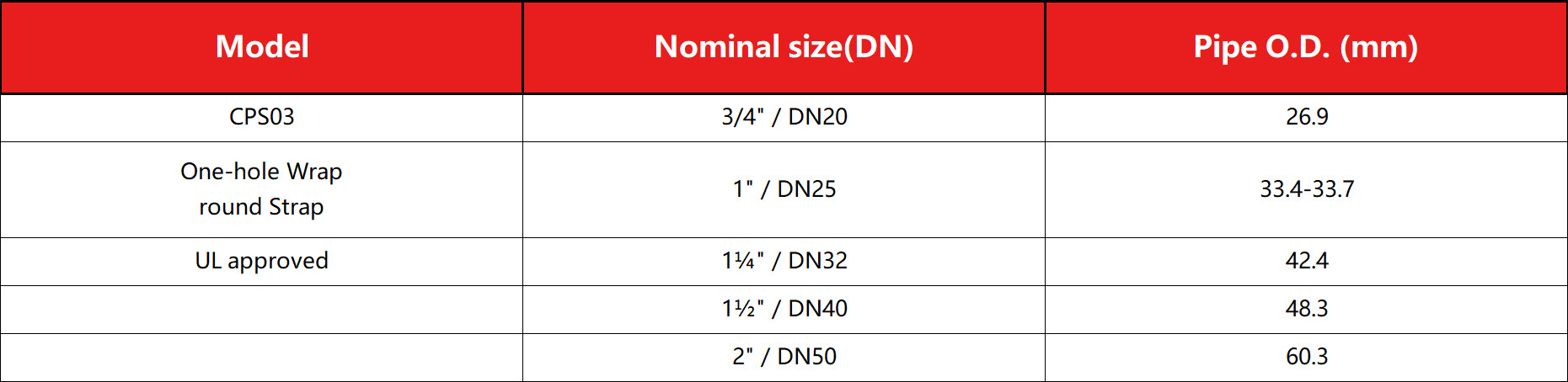 Dimensions and load capacity vary by pipe size. Refer to the table below for detailed specifications.
