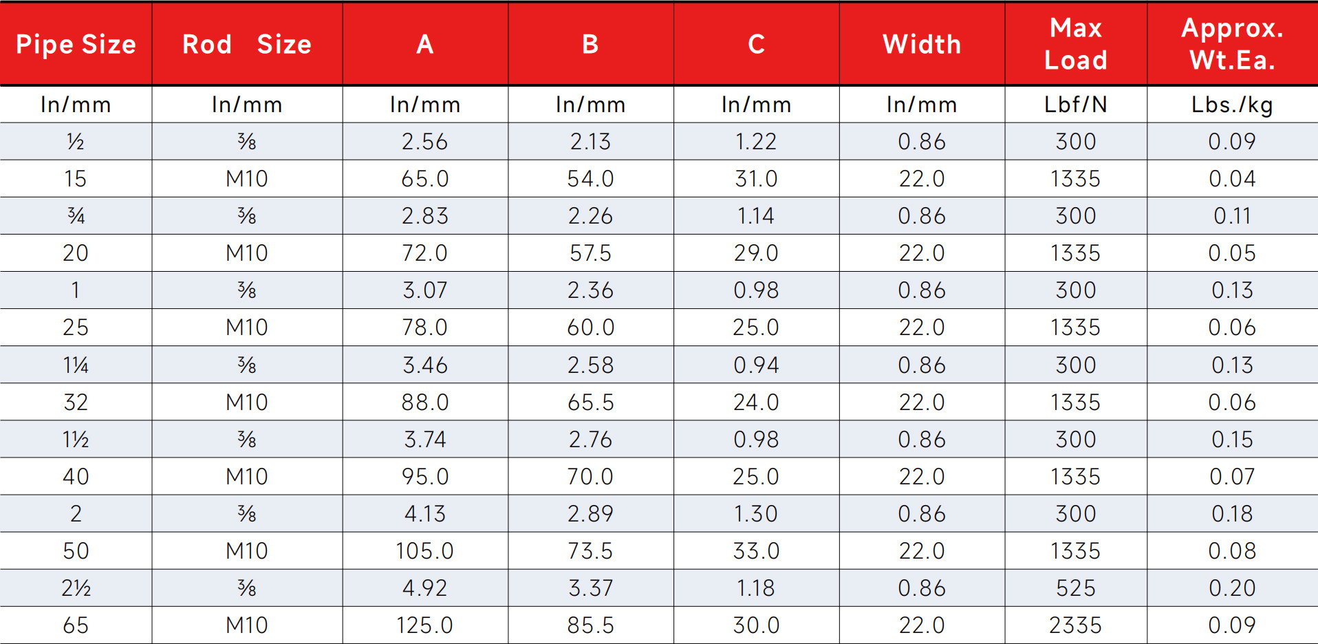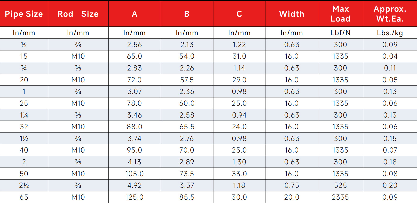 Dimensions and load capacity vary by pipe size. Refer to the table below for detailed specifications.